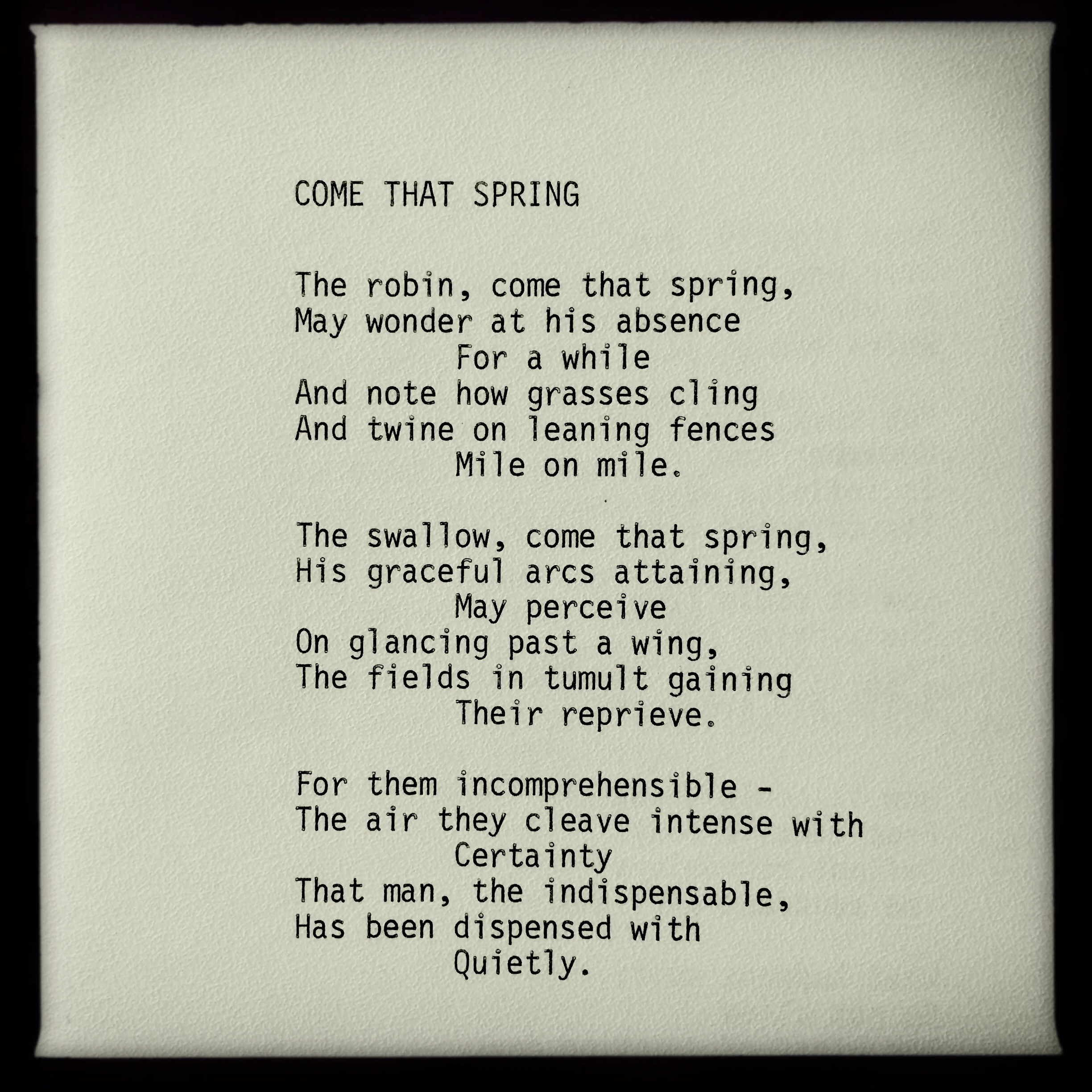 On page 3 of “Act One”, the first (and only) book of George Murray’s poems, is one entitled, “COME THAT SPRING”. The month of this blog post is June (the last week of it), with Spring a damp, blustery memory, so this poem may seem seasonally-incorrect, but its message is not. Read more than once, and enjoy…
